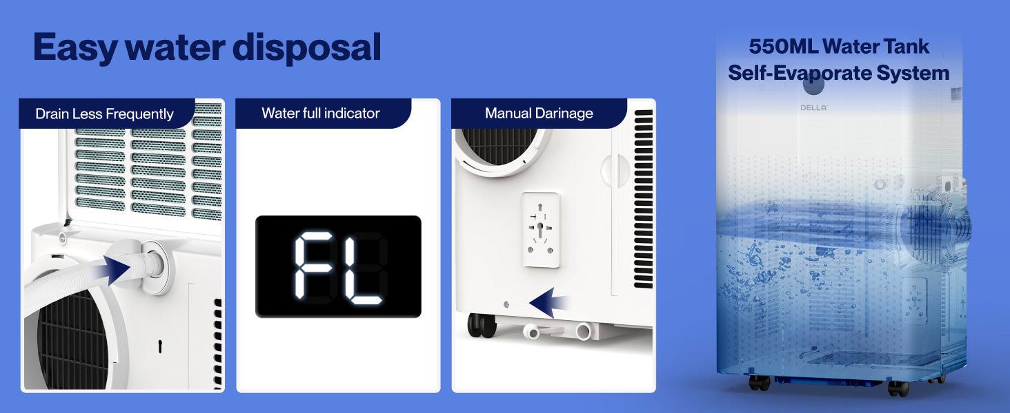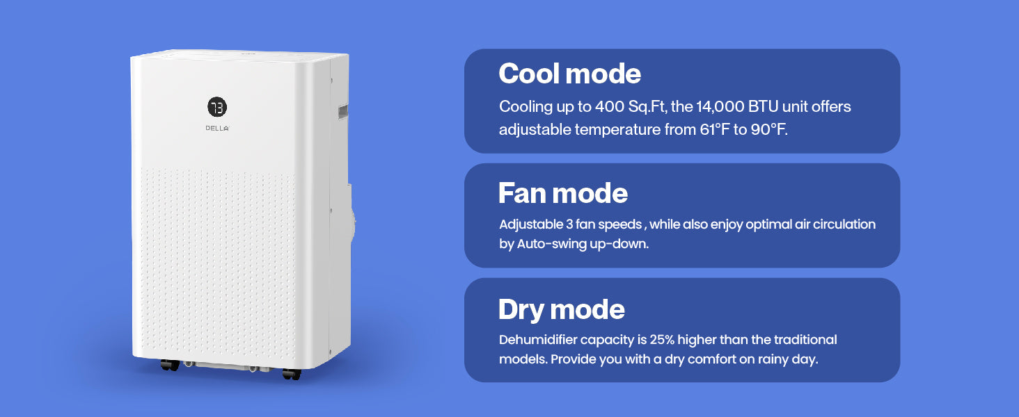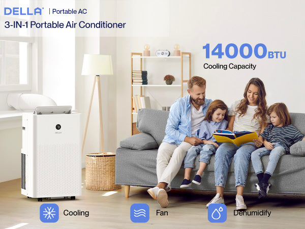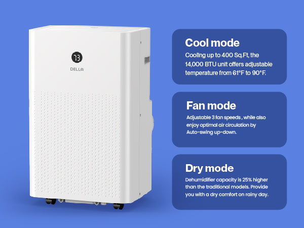 Discover the future of home comfort with DELLA’s 14000 BTU portable air cooler. Engineered for everyday excellence, this modern and sleek unit combines cooling, fan, and dehumidification modes to ensure immediate, uninterrupted comfort. With three fan speeds, a water-full warning system to protect your floors, and a 24-hour timer for energy savings, it’s perfect for any space—home, office, garage, or dorm. Enjoy quiet performance, easy mobility, and a user-friendly digital LED display. With DELLA, experience the perfect blend of style, functionality, smart technology, and value.