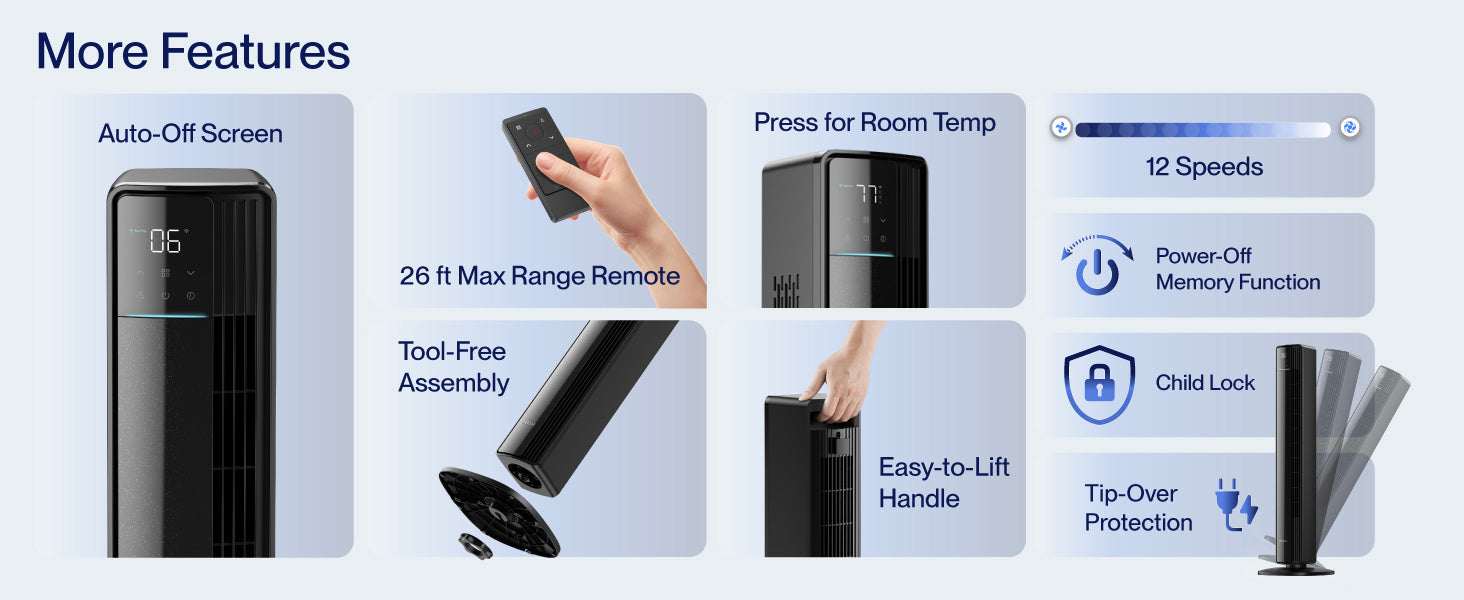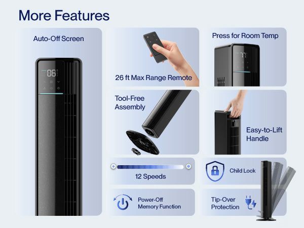 This advanced bladeless tower fan features a larger brushless DC motor and an expanded fan cylinder, delivering up to 82% more airflow than standard models. With a top speed of 28 ft/s and up to 1950 CFM of circulating air, it cools your room fast and effectively.