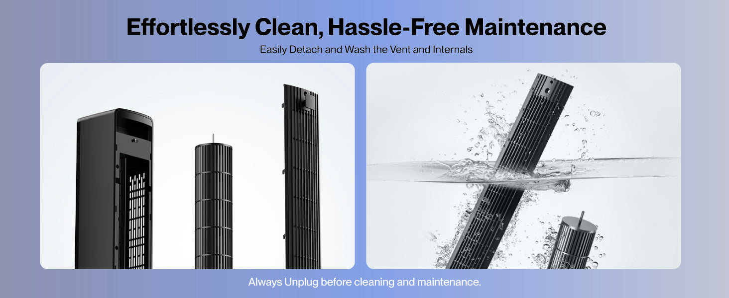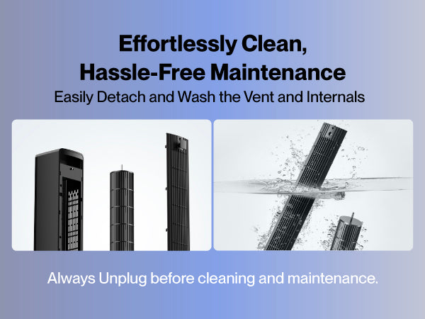 Cleaning is effortless with detachable, washable components, and safety is prioritized with tip-over protection, child lock, and FCC & SGS certifications. Always unplug before cleaning for added safety.