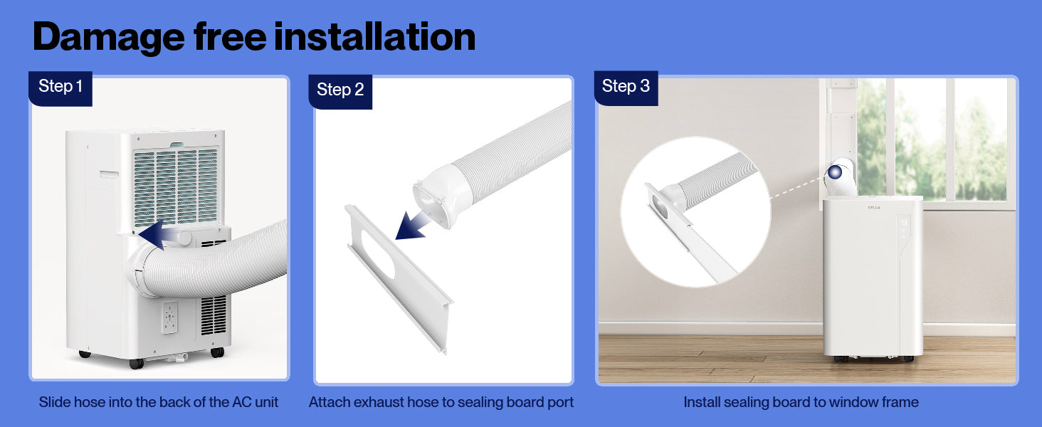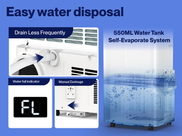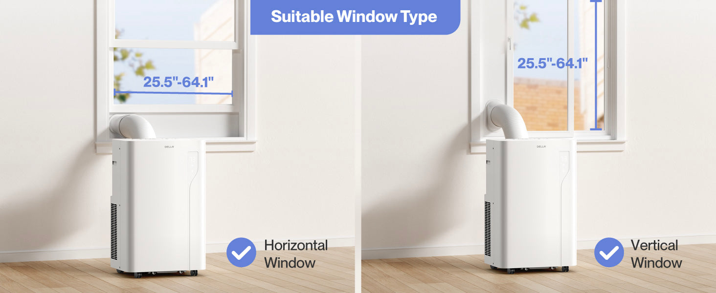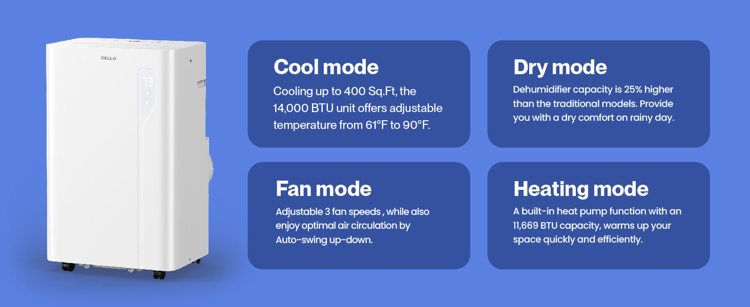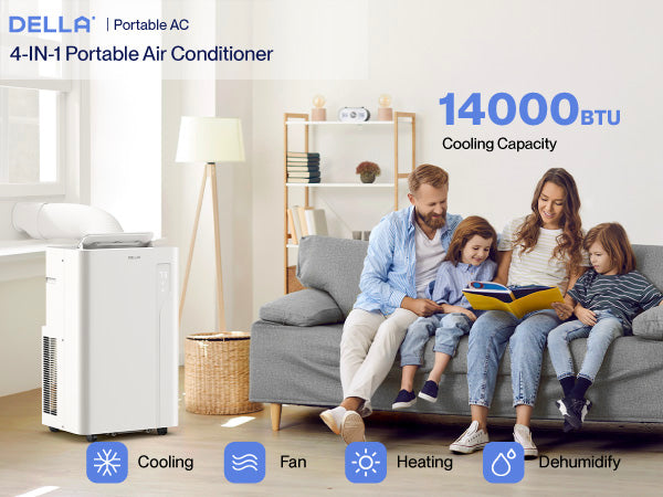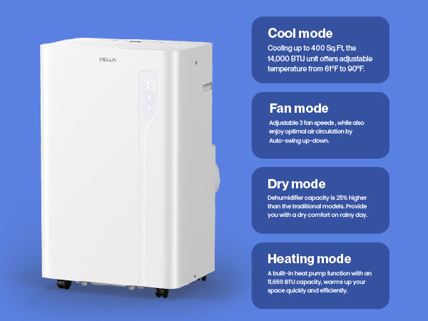 Experience year-round comfort with the Della 14,000 BTU Portable Air Conditioner with heat pump! Ideal for rooms up to 800 square feet, this versatile unit provides both cooling and heating. With features like a self-evaporating system, powerful dehumidifier removing up to 68 pints/day, and a 24-hour timer, it ensures efficient climate control in any season. The Della app and remote control offer effortless operation, while the adjustable window kit makes installation a breeze. Easy to move with its casters and side handles, and designed with a washable filter to keep the air clean, this compact unit is perfect for any space. Stay comfortable all year with Della!
